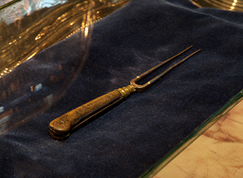 1582年3月4日。鹿狩りの帰りだった国王アンリ三世と貴族達が来店。隣りのテーブルでフィレンツェから来た貴族が小さなとがった道具を使っていました。王が尋ねるとヴェニスから届いたばかりの発明品とのこと。それまで、フランスの人々はフォークというものの存在を知りませんでした。これがフランスの食文化史上初めてフォークというものが登場した場面です。すぐに国王は取り寄せるよう命じ、その後、宮廷に導入されました。