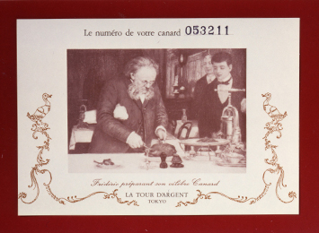 19世紀末。当時の支配人フレデリック・デレールの鴨料理は評判を呼び、手掛けた鴨の一羽一羽ごとに番号を付けるというユニークなアイディアで、トゥールダルジャンの名をさらに広めていったのです。ちなみに、1921年6月21日。当時、皇太子であらせられた昭和天皇がパリ本店で召し上がられた際の鴨番号が「53211」。この番号を記念すべき番号と定め、敬意を表して、この番号の次の番号を、後に誕生するトゥールダルジャン 東京での最初の番号としました。