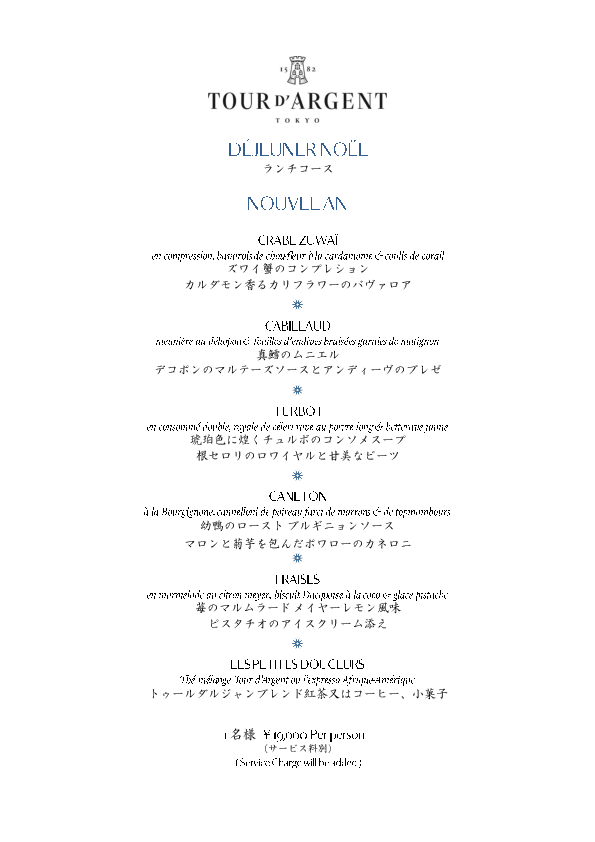 | 料金 | お飲物別 19,000円(税金共・サービス料別) お飲物共 24,000円(税金共・サービス料共) |