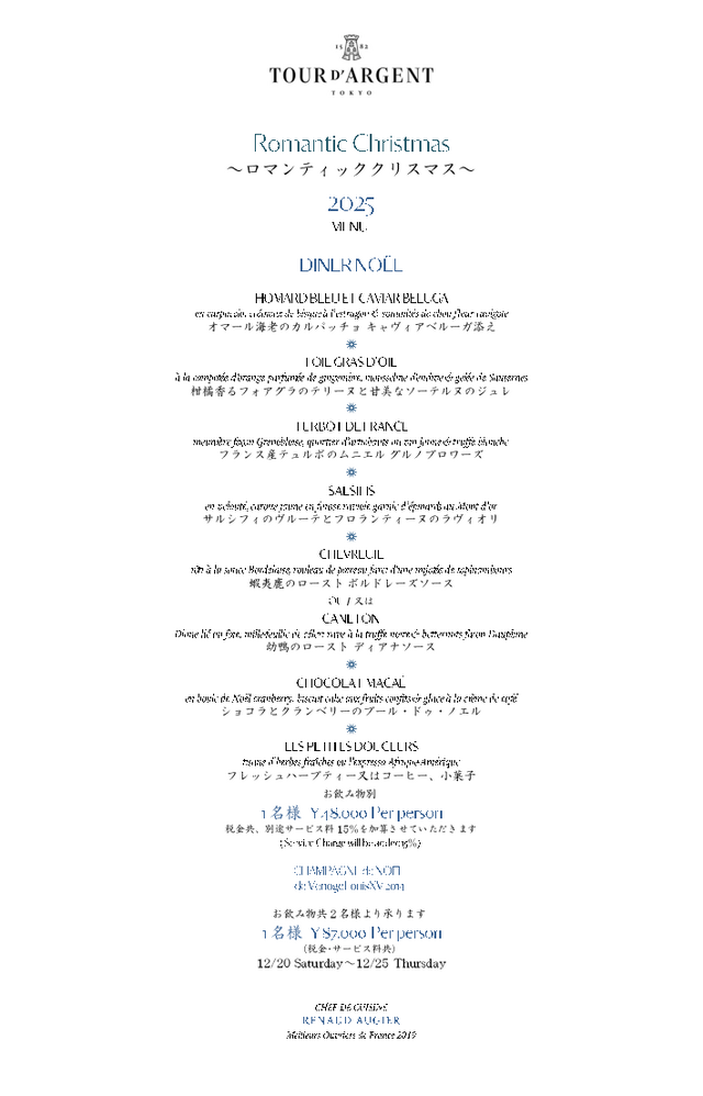 フランス料理界最高峰の称号“M.O.F.”(フランス国家最優秀職人章)受章 エグゼクティブシェフ、ルノー・オージエによるクリスマス特別ディナーをお届けいたします。
