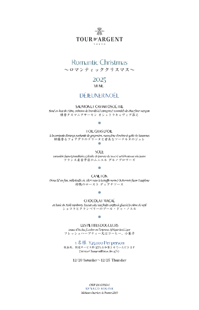 フランス料理界最高峰の称号“M.O.F.”(フランス国家最優秀職人章)を2019年受章したエグゼクティブシェフ、ルノー・オージエがシグネチャーメニューの幼鴨料理はもちろん、テーブルを彩るクリスマス特別ランチメニューをお届けいたします。