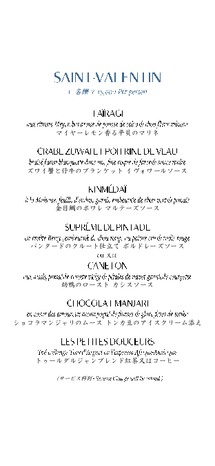 フランス料理界最高峰の称号“M.O.F.”(フランス国家最優秀職人章)受章シェフ、ルノー・オージエによるシグネチャーメニューの幼鴨料理はもちろん、バレンタインにちなんだ期間限定メニューをお愉しみください。
